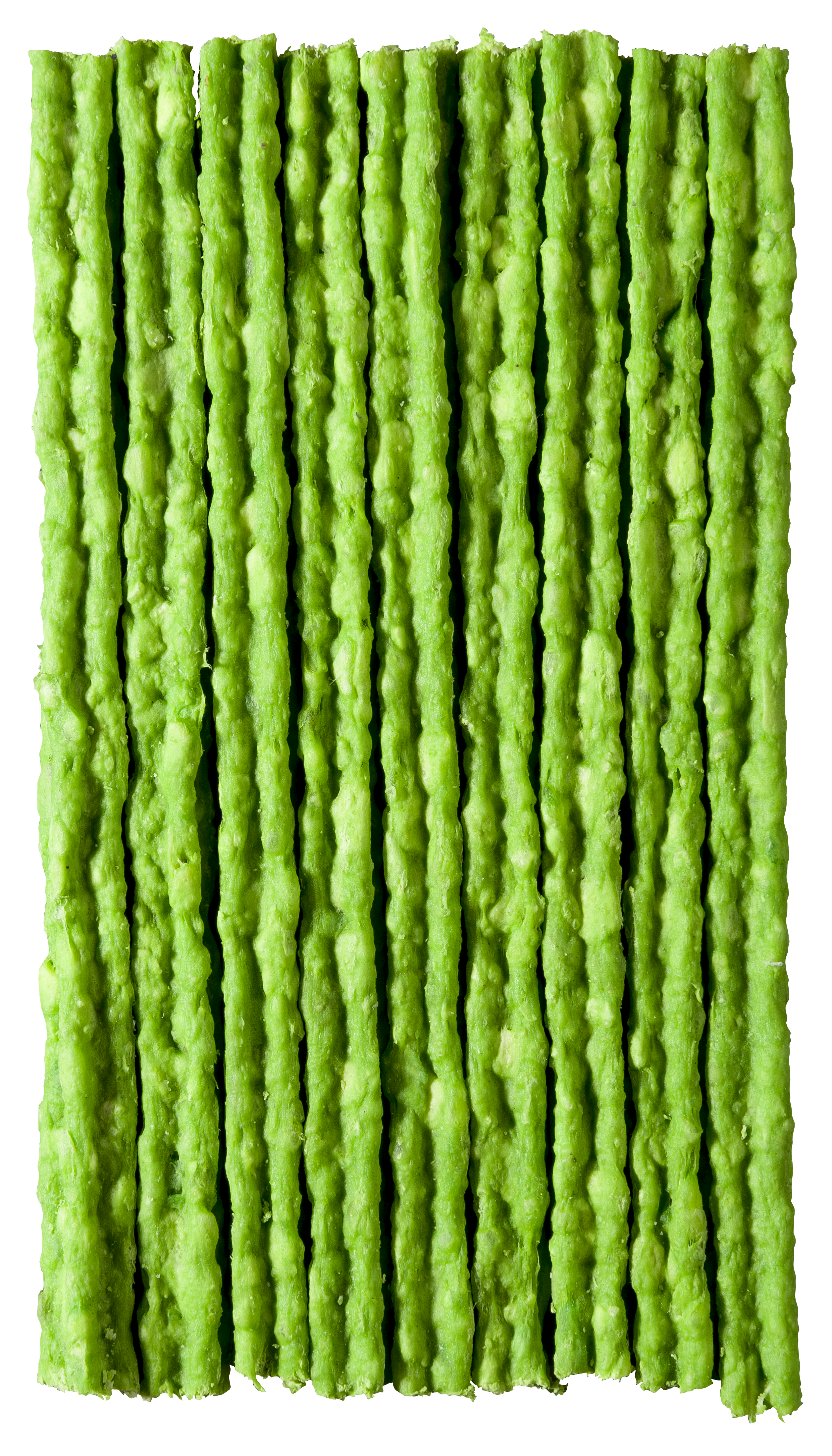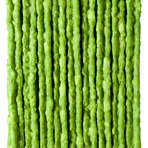 Ingredientes: Raspa de pele conservada de bovino, glicerina, quirera de arroz, farinha de mandioca, farinha de trigo, fécula de mandioca modificada, carbonato de cálcio, sorbato de potássio, propionato de cálcio, pimenta preta (Piper nigrum), aroma de menta.